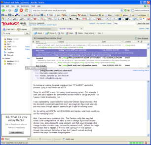 As first reported in June, the new Yahoo Mail beta will feature e-mail caching; message preview; drag-and-drop filing; the capability of quickly searching e-mail headers, body text and attachments; and the ability to view multiple e-mails at the same time in separate windows and scroll through all message headers in a folder rather than one page at a time.